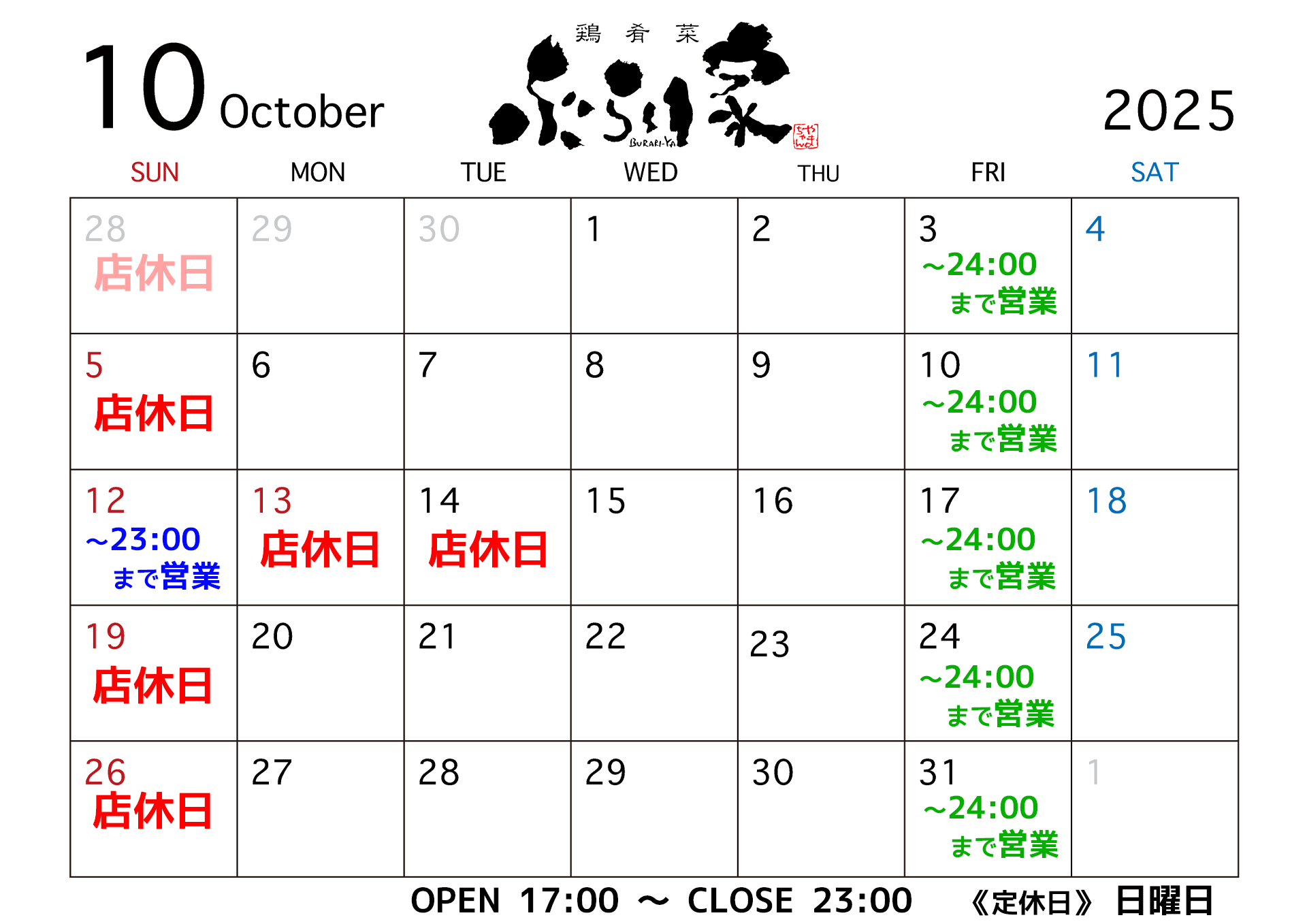 10月の店休日、変則営業時間につきましてご案内いたします。