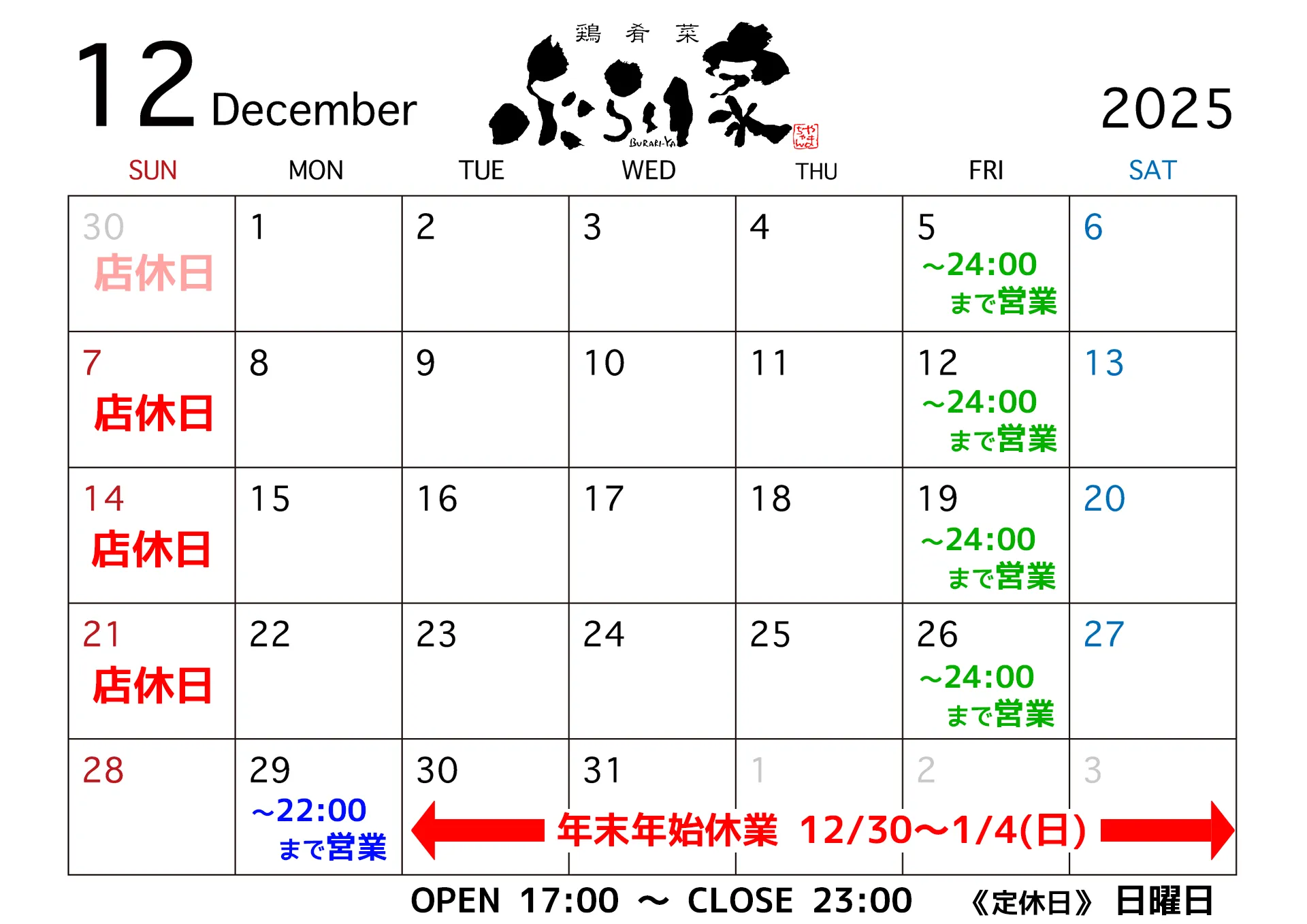 12月の店休日と年末年始の営業情報につきましてご案内いたします。