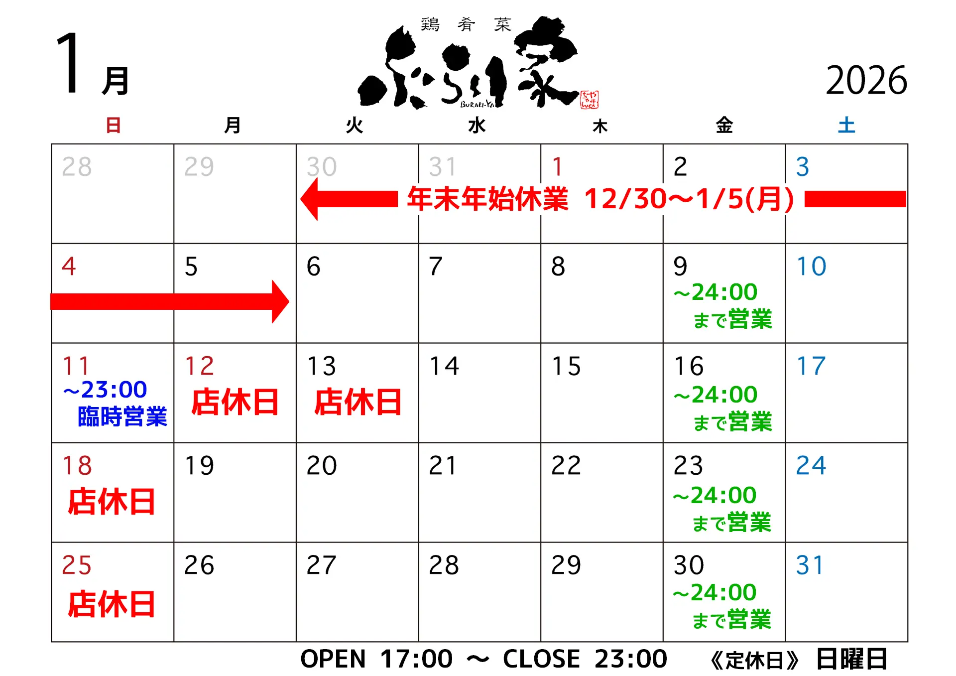 1月の店休日、変則営業時間につきましてご案内いたします。